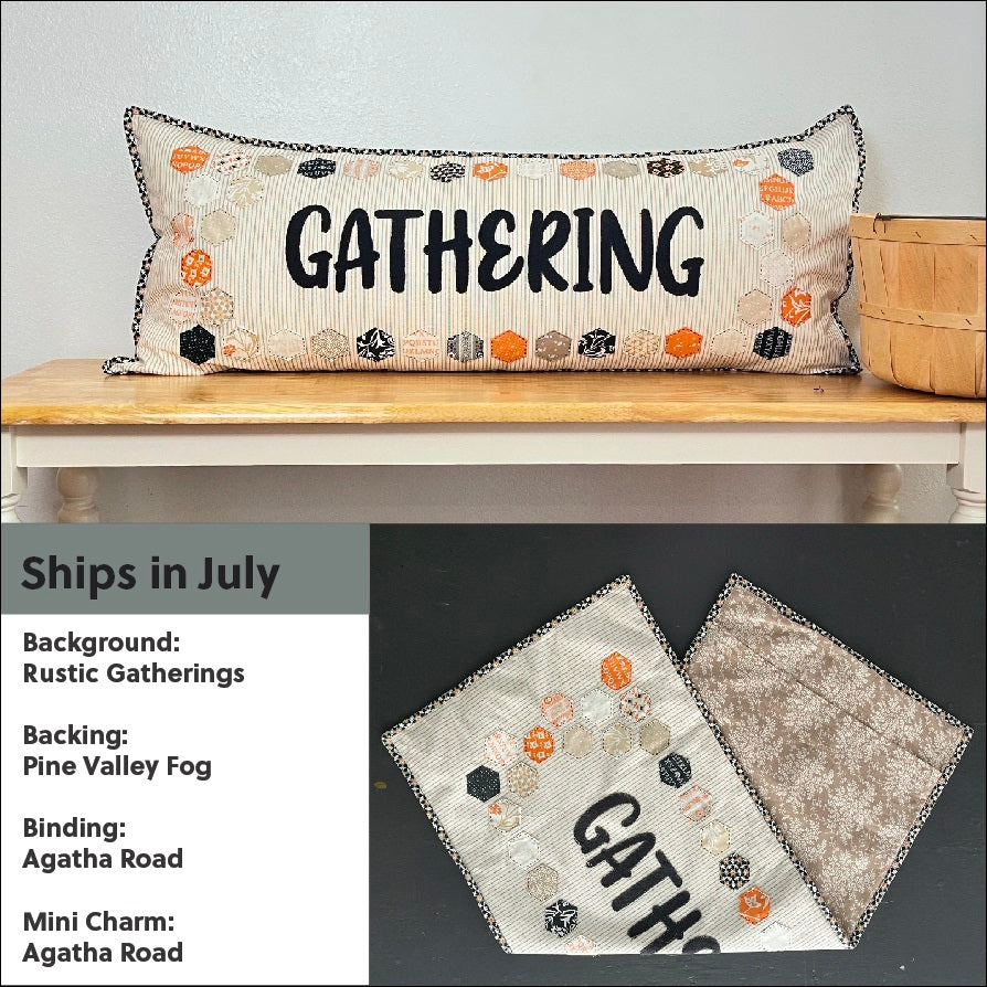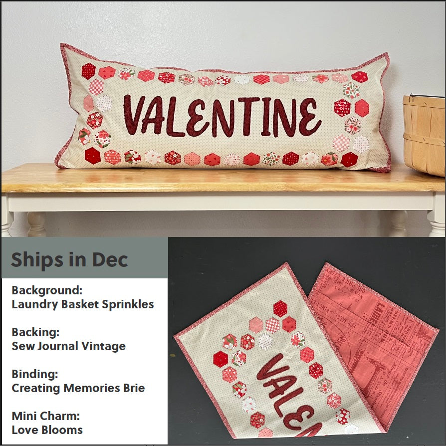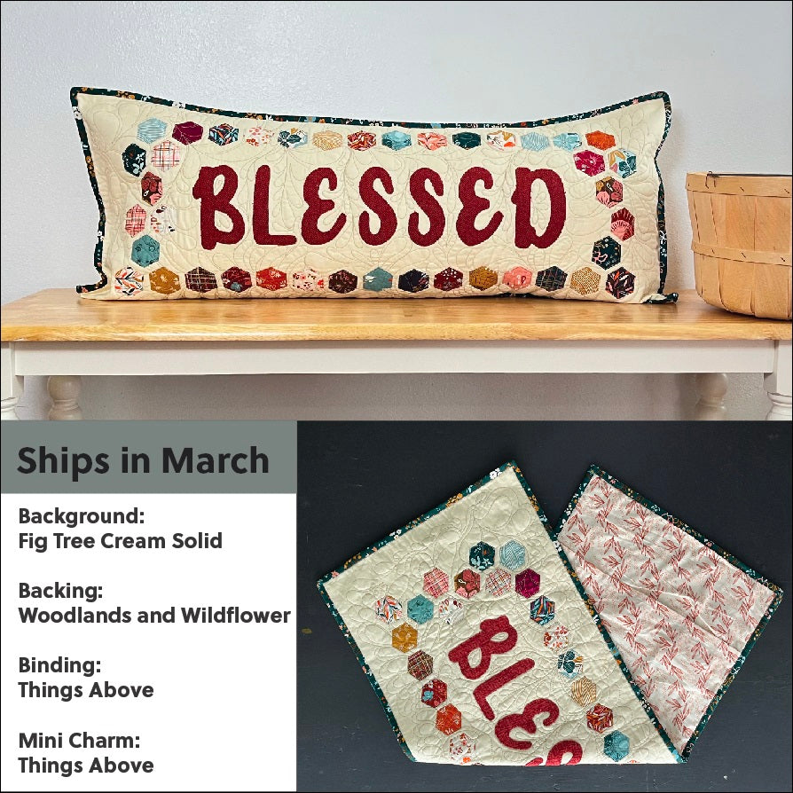 Make a big statement with a little Mini Charm. If you love to switch out your favorite Bench, check out this easy Hexi project. Monthly kits with a different saying for each month. Choose the word we've picked for each kit or add on our Embroidered Applique Alphabet to make this pillow truly unique.