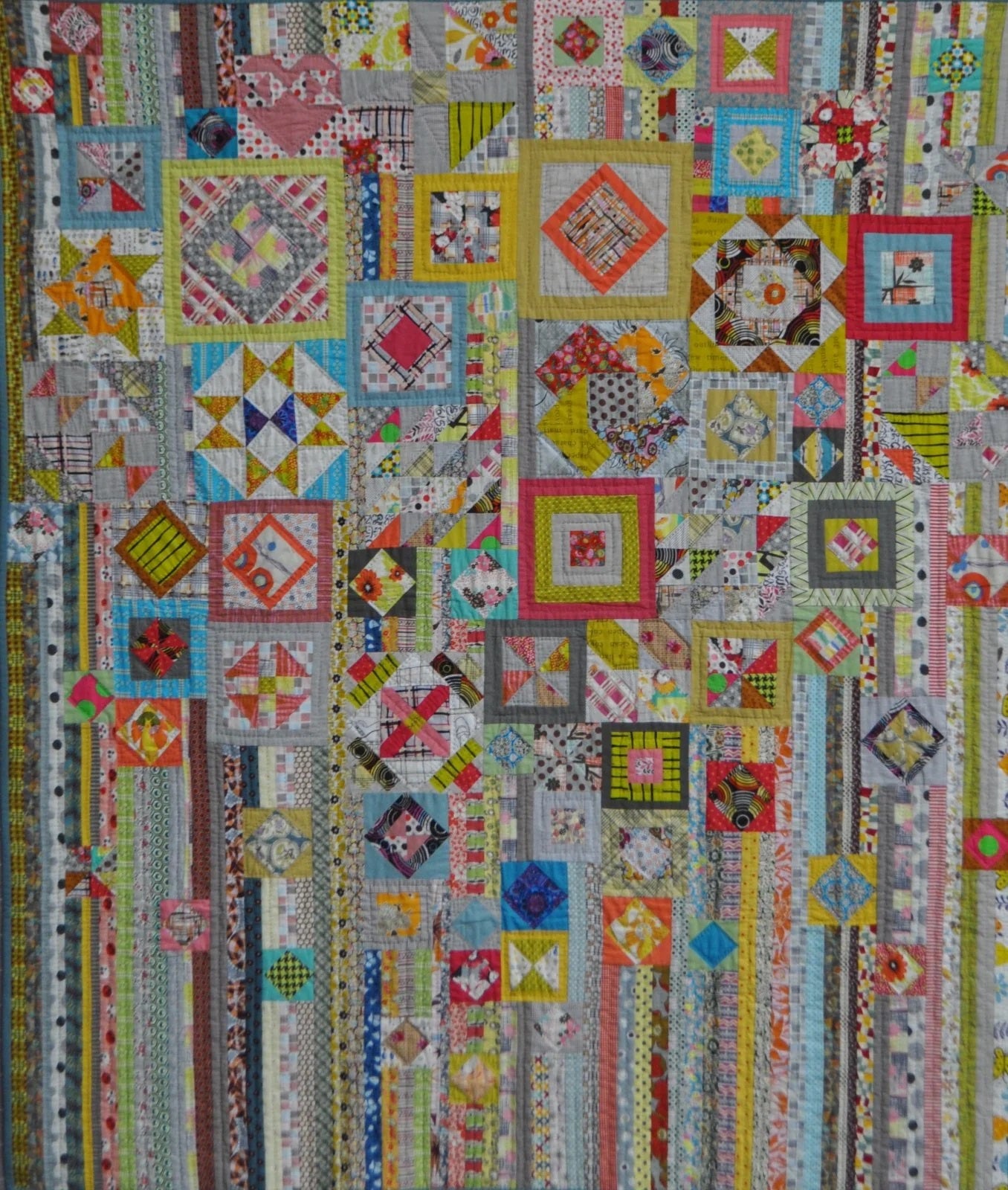 Quilt Measures 59 x 68in. Scrappy quilt with several sample type blocks scattered throughout. You eye will wander and though it never rests there is beauty everywhere you look..