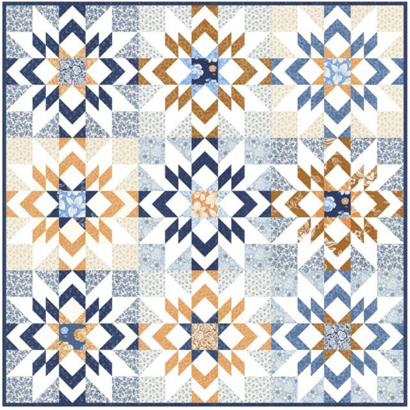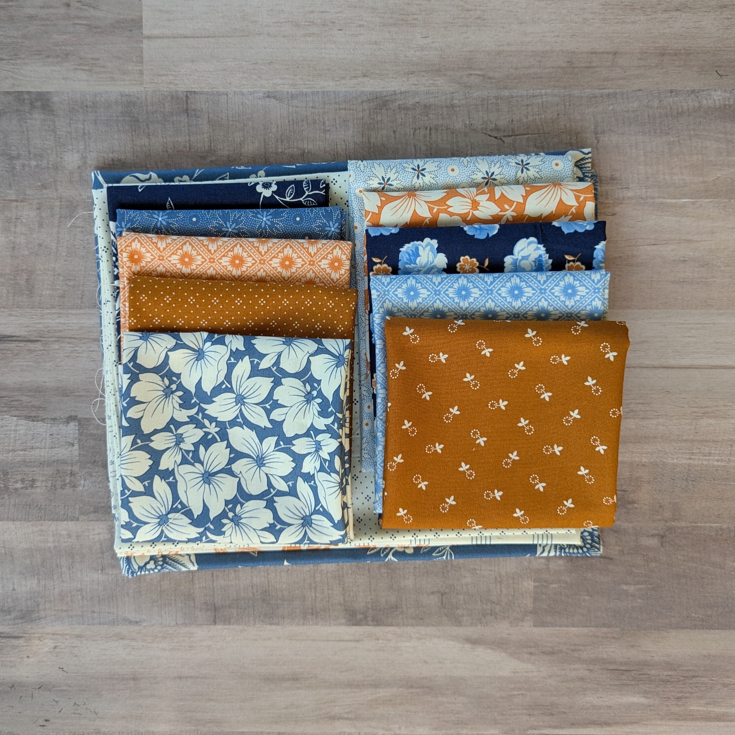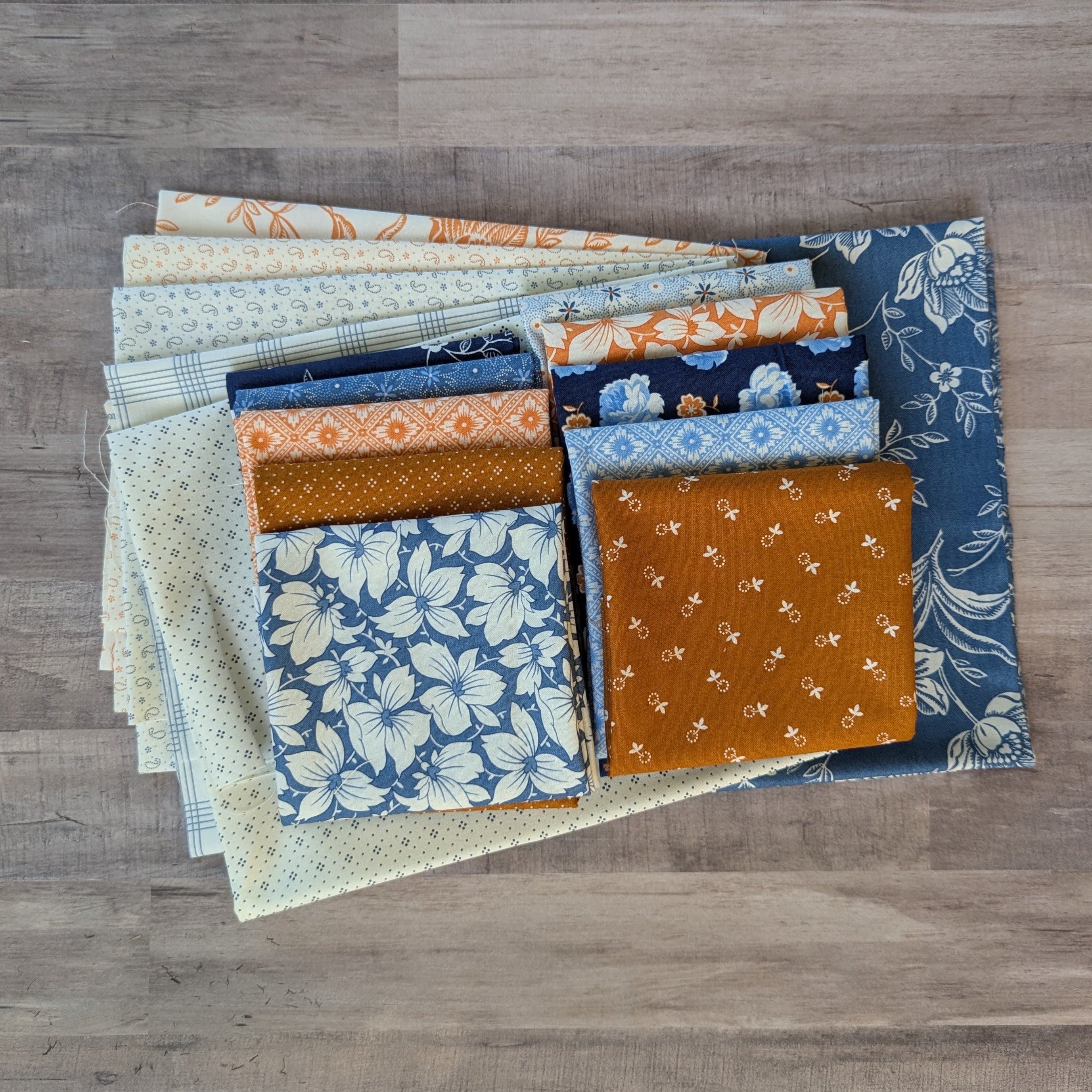 Create a favorite vintage look scrappy quilt kit using Denim and Daisies from Fig Tree Quilts with additional Moda coordinates