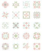 Coral, Apricot and Peach with a dash of grey and a summery aqua. This printed panel has 20 cross stitch look blocks. Each measure approx 6in.