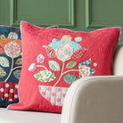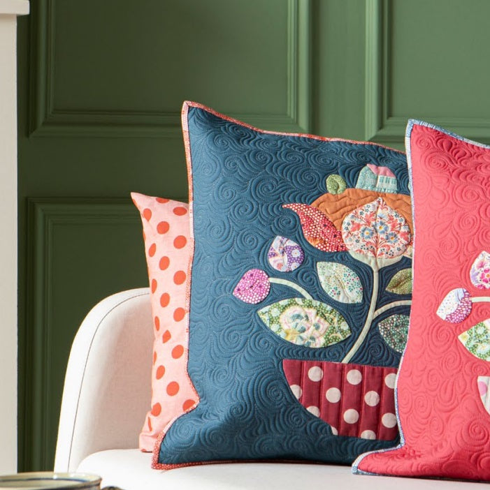 If you need the perfect project to accompany your Put Down Roots quilt or if you don't want to brave a full applique quilt, this pillow is the perfect solution. This truly lovely pillow will draw attention and is sure to become a treasured heirloom. A single appliqué block in two different colourways. The method used is turned-edge appliqué, with the motifs sewn to a Solid peacock or country red background.