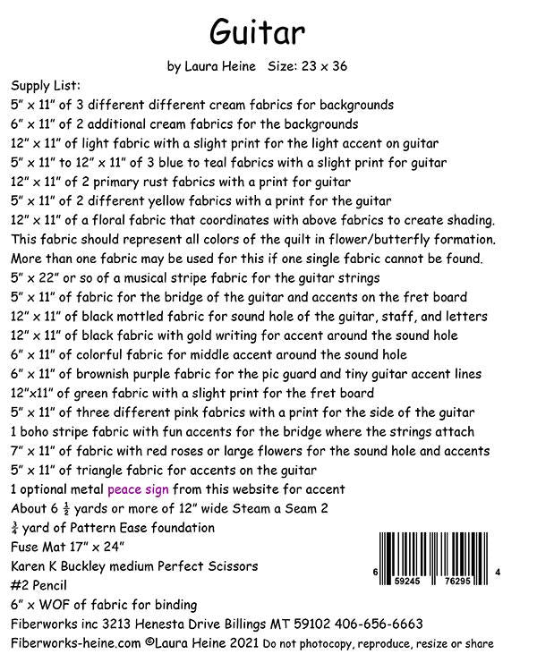 Guitar Collage pattern by Laura Heine includes full sized pattern and complete step by step color photo instruction. Size 23 x 36.
