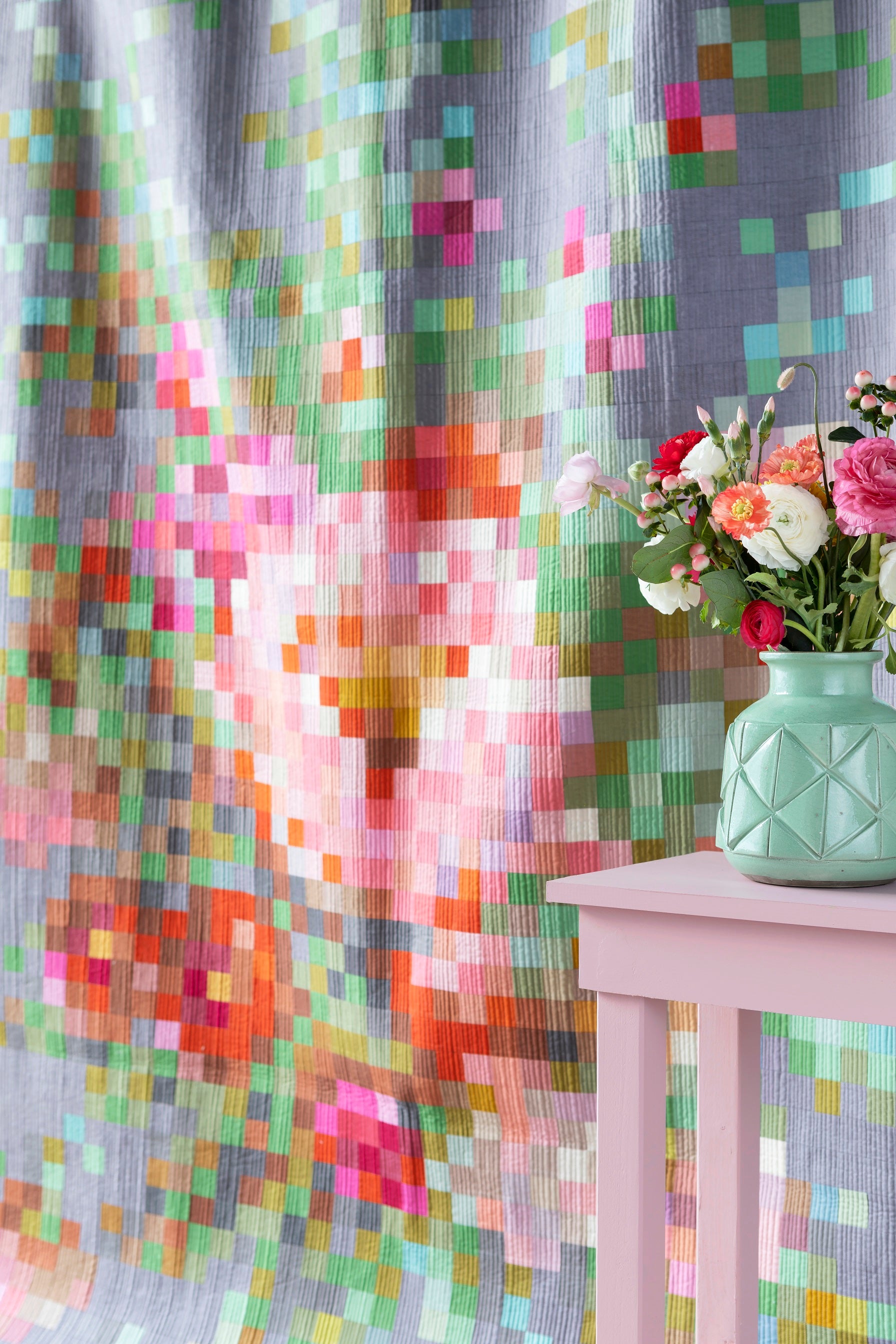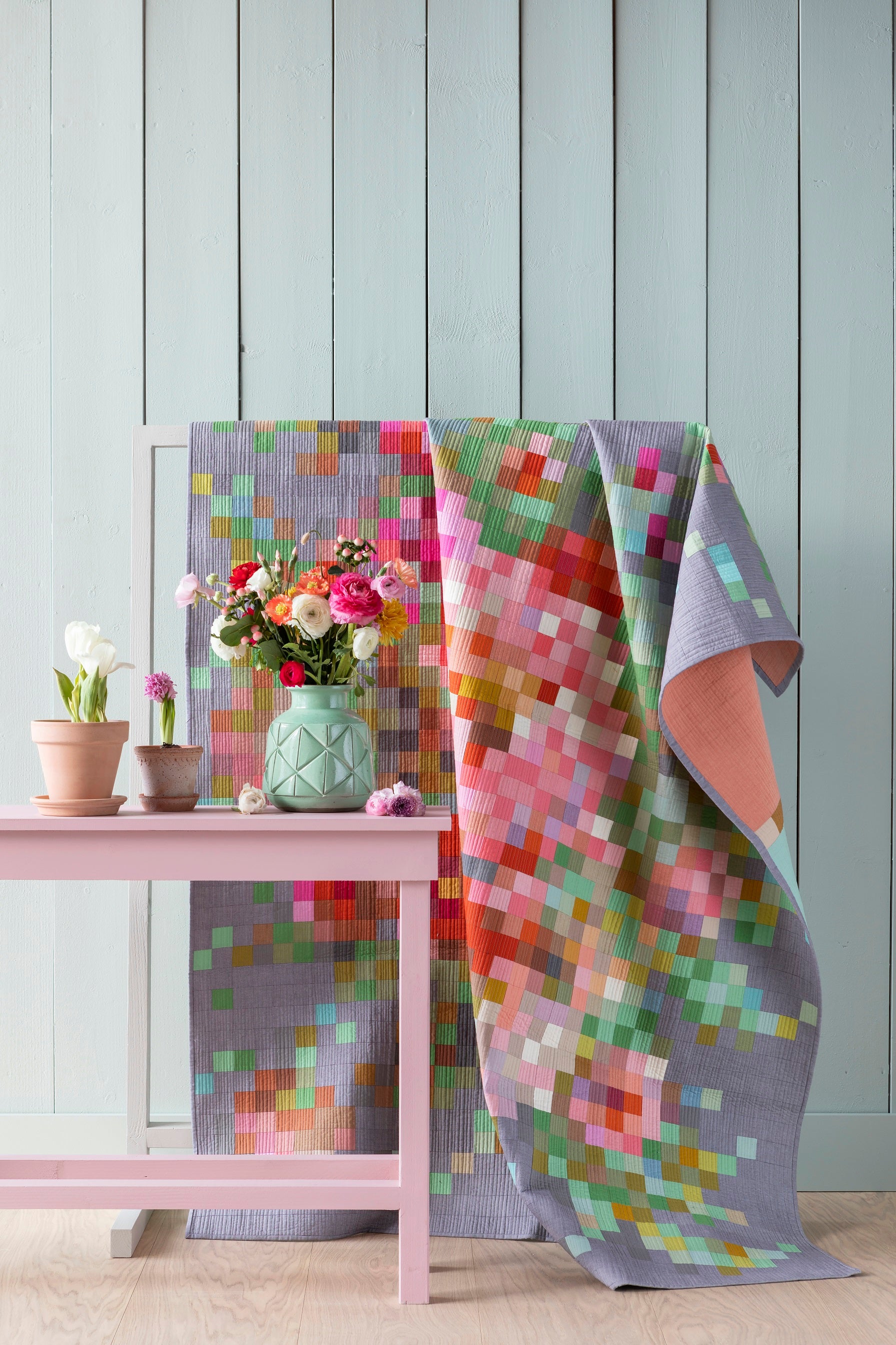 Embroidery Flower Quilt Kit featuring Tilda Solids Fabrics sized at 63.5 x 81.5in