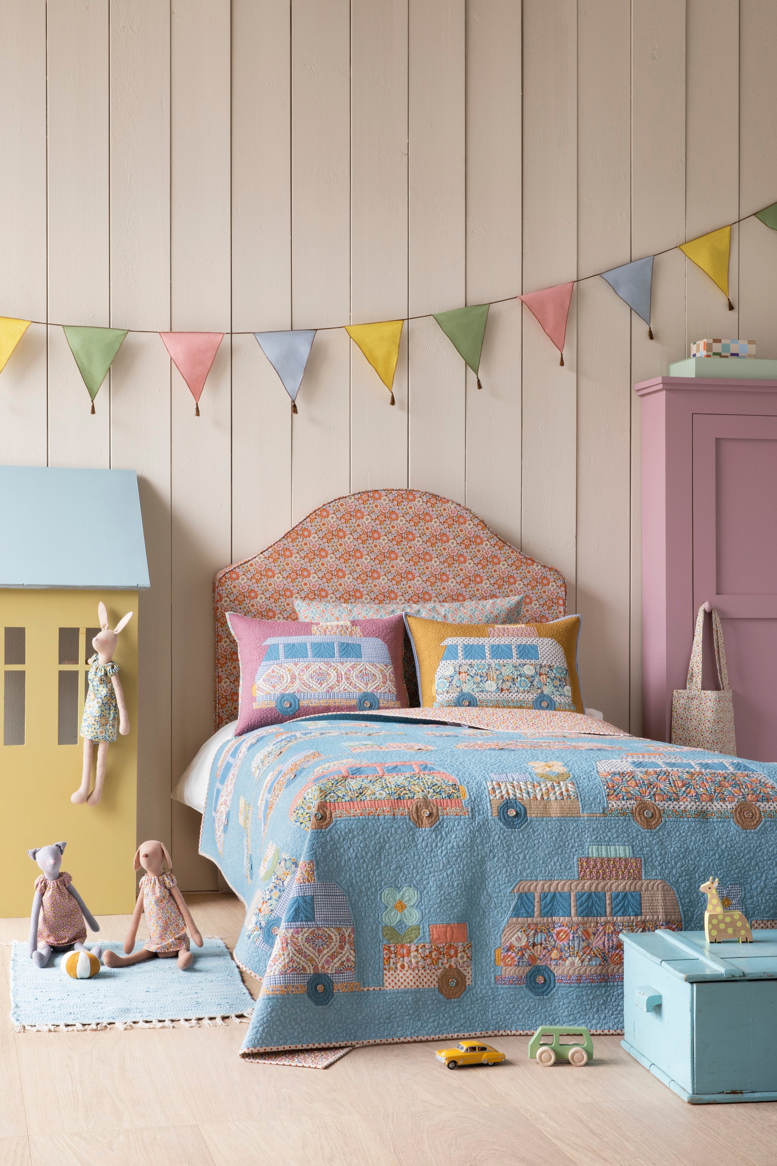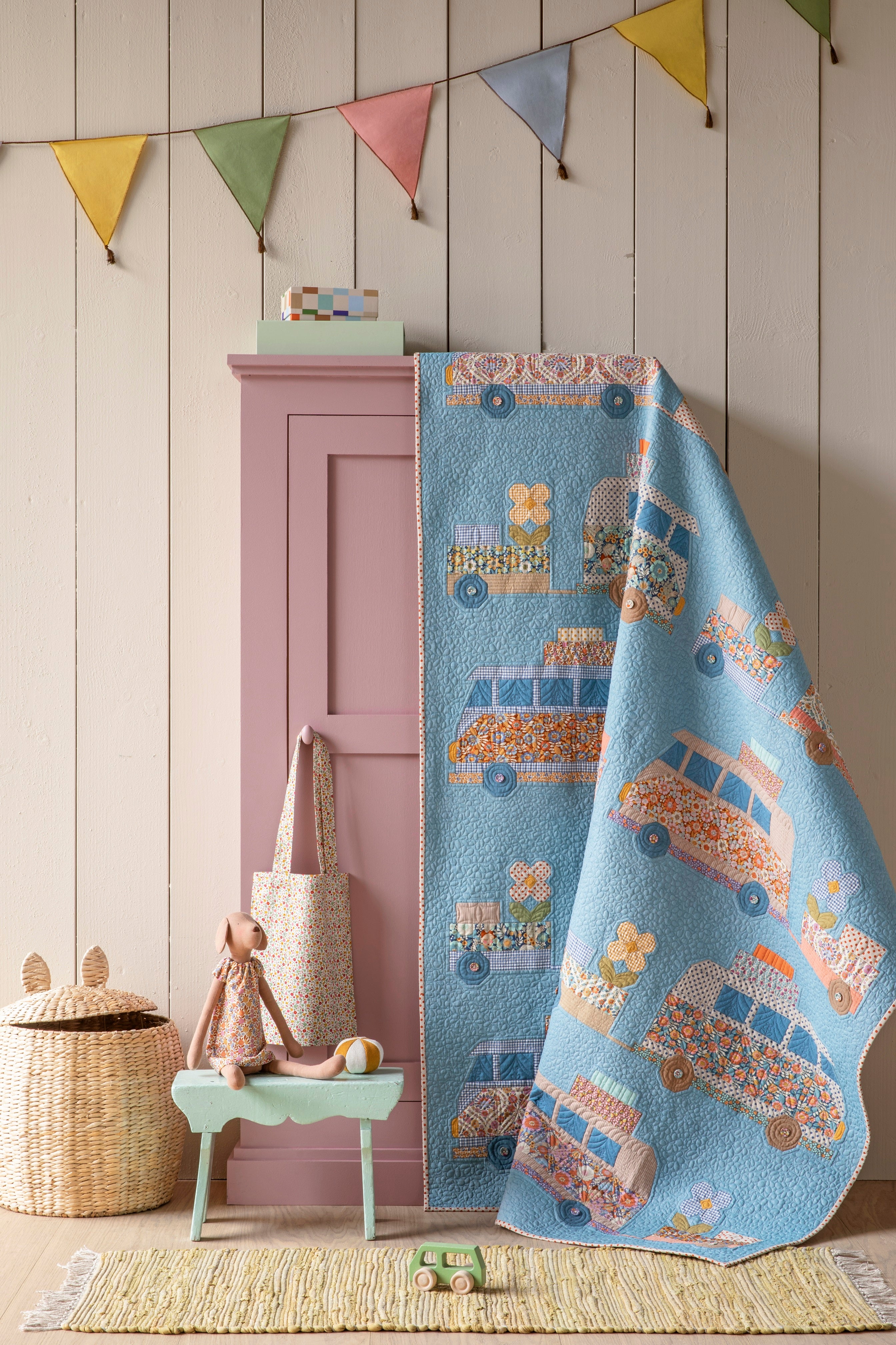 This quilt is the perfect project for those who love travel and the freedom it brings. Iconic camper van on a Chambray Petrol background with blue and caramel accents. Uses Wallflower line and Creating Memories line