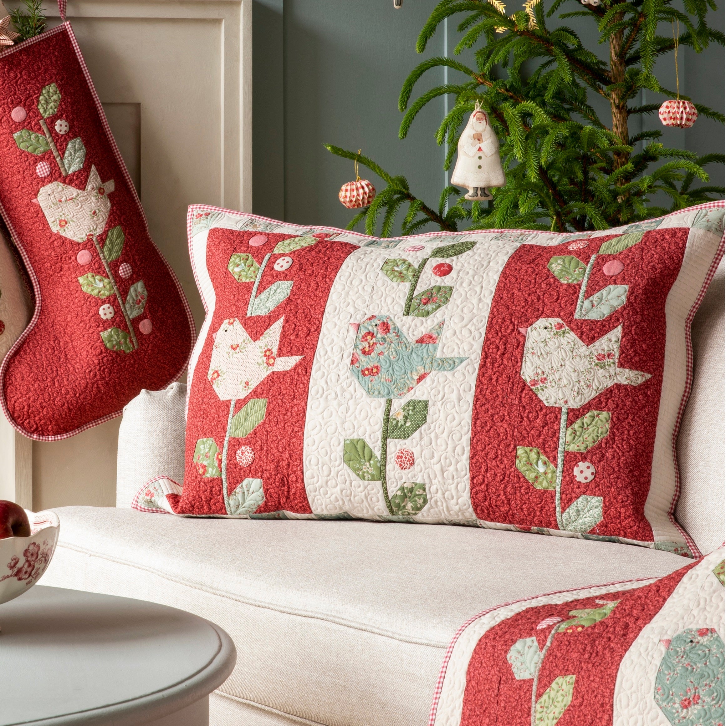 Generously sized, this pillow is ideal for snuggling up to during the winter and is also the perfect companion to the Winter Bird quilt. This version of the pillow uses a warm burgundy print for the background, contrasting with a putty white Chambray fabric. The Merry Little Christmas fabric collection and its blenders feature lots of festive reds, greens, creams and duck egg blues.