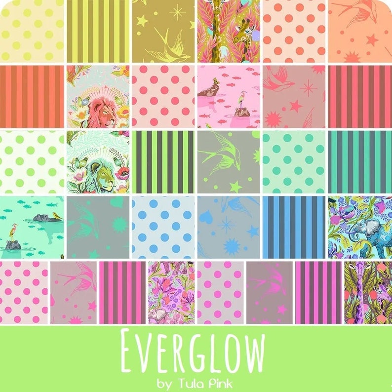 Everglow is a full collection of radical color designed to add depth to the Tula Pink world of fabrics. Tula Pink touches on the world of neutrals, using the subtle colors to create the perfect vibrant backdrop of color that you love. Each neutral is paired with a corresponding neon. Each in a light, medium and dark. Everglow has 4 large focal prints in two colors each to tie them all together. The animals in Everglow are centered around those that would naturally occur in those palettes. Golden giraffes, blue grey elephants, silver hippos and coppery lions. Each animal is represented in a more accurate color palette and a contrasting color palette that is otherworldly! The result is 8 mini color palette collections that merge together to create an oasis of rainbow goodness in unexpected combinations.