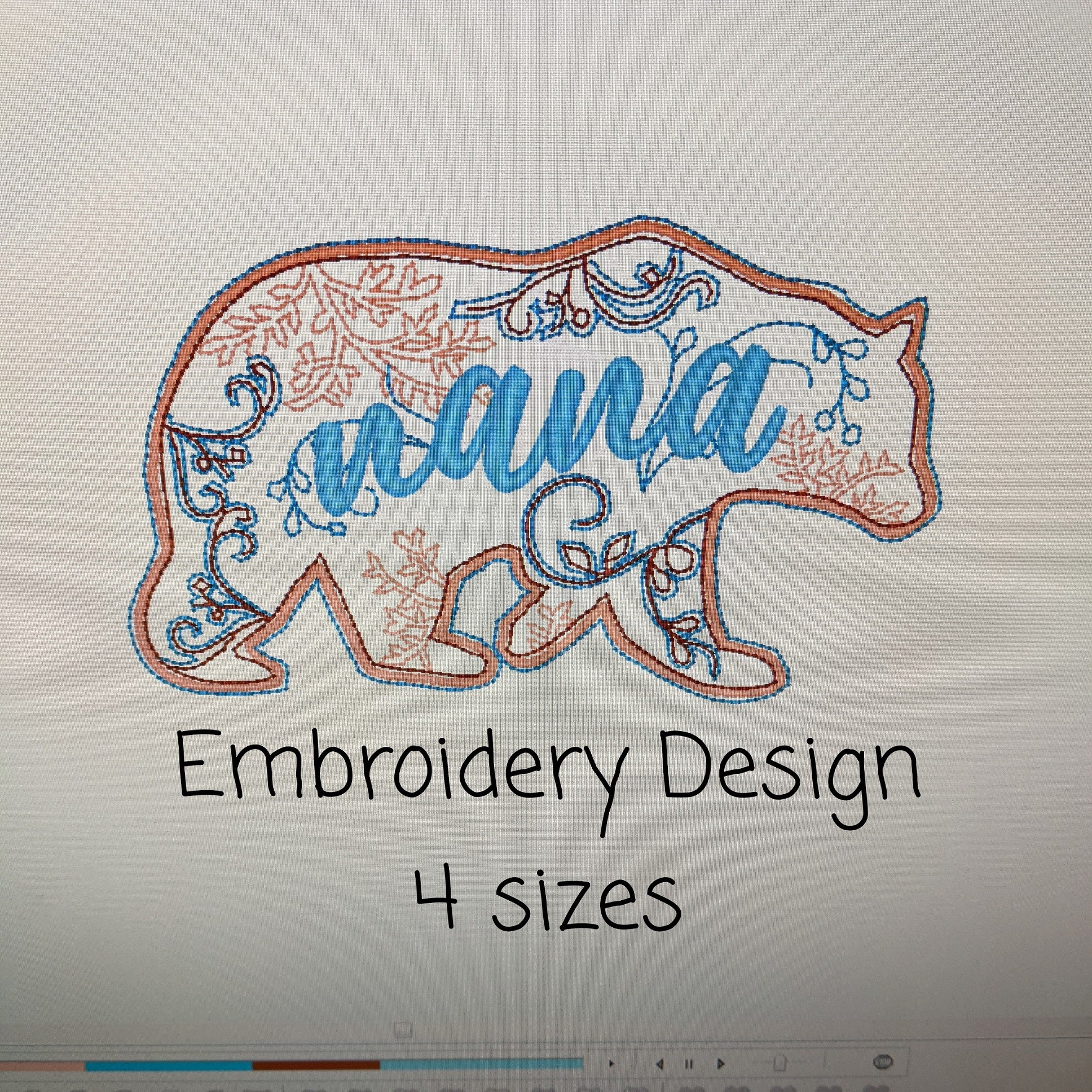 This design includes 4 sizes of the nana bear embroidery design.