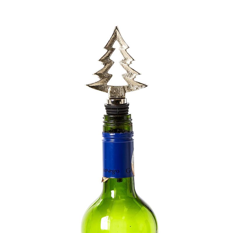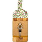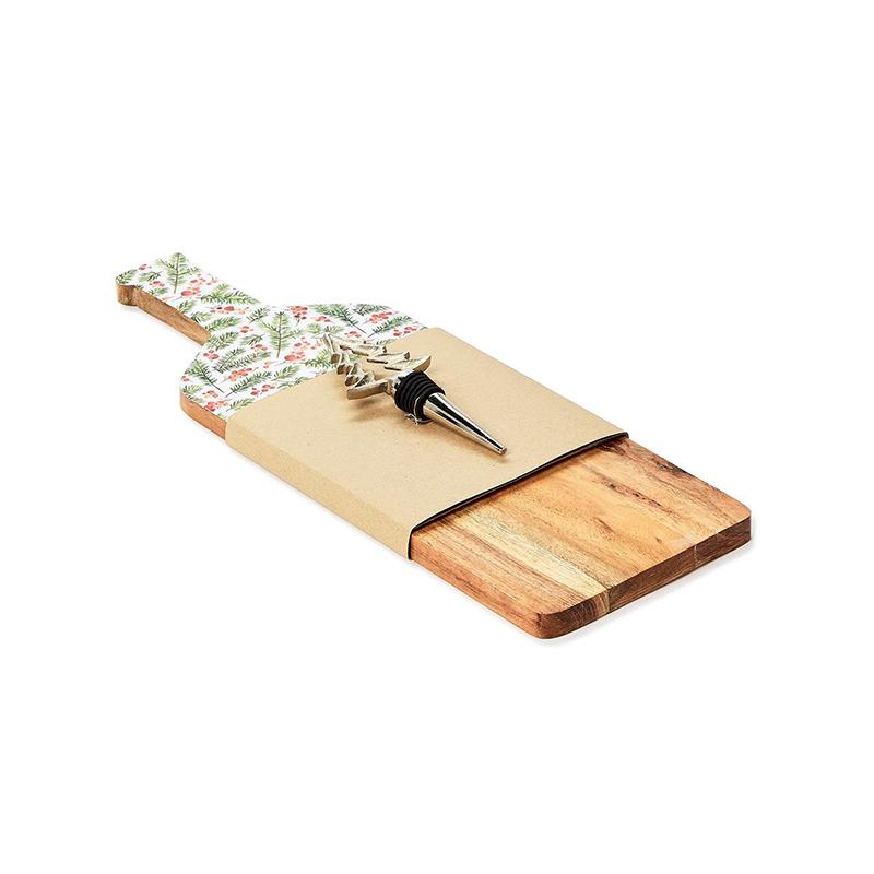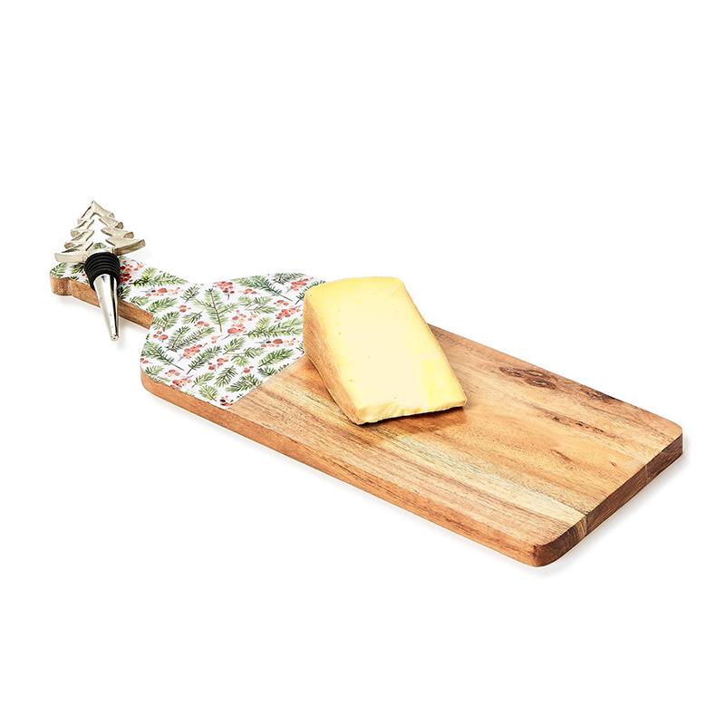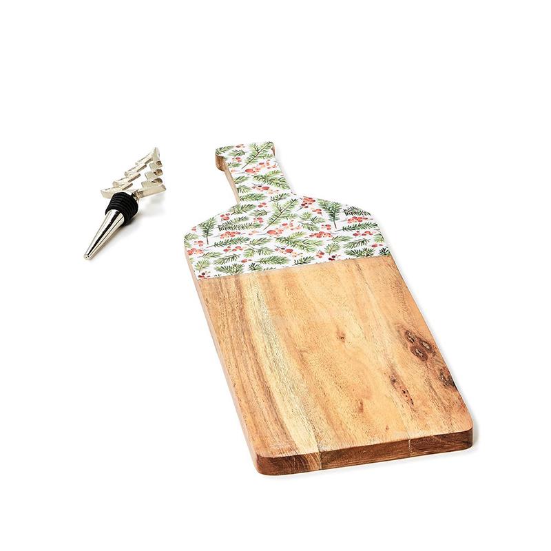 Merry Berry serving charcuterie board with enamel accent and tree shaped bottle stopper set. Made from food safe Mango wood.